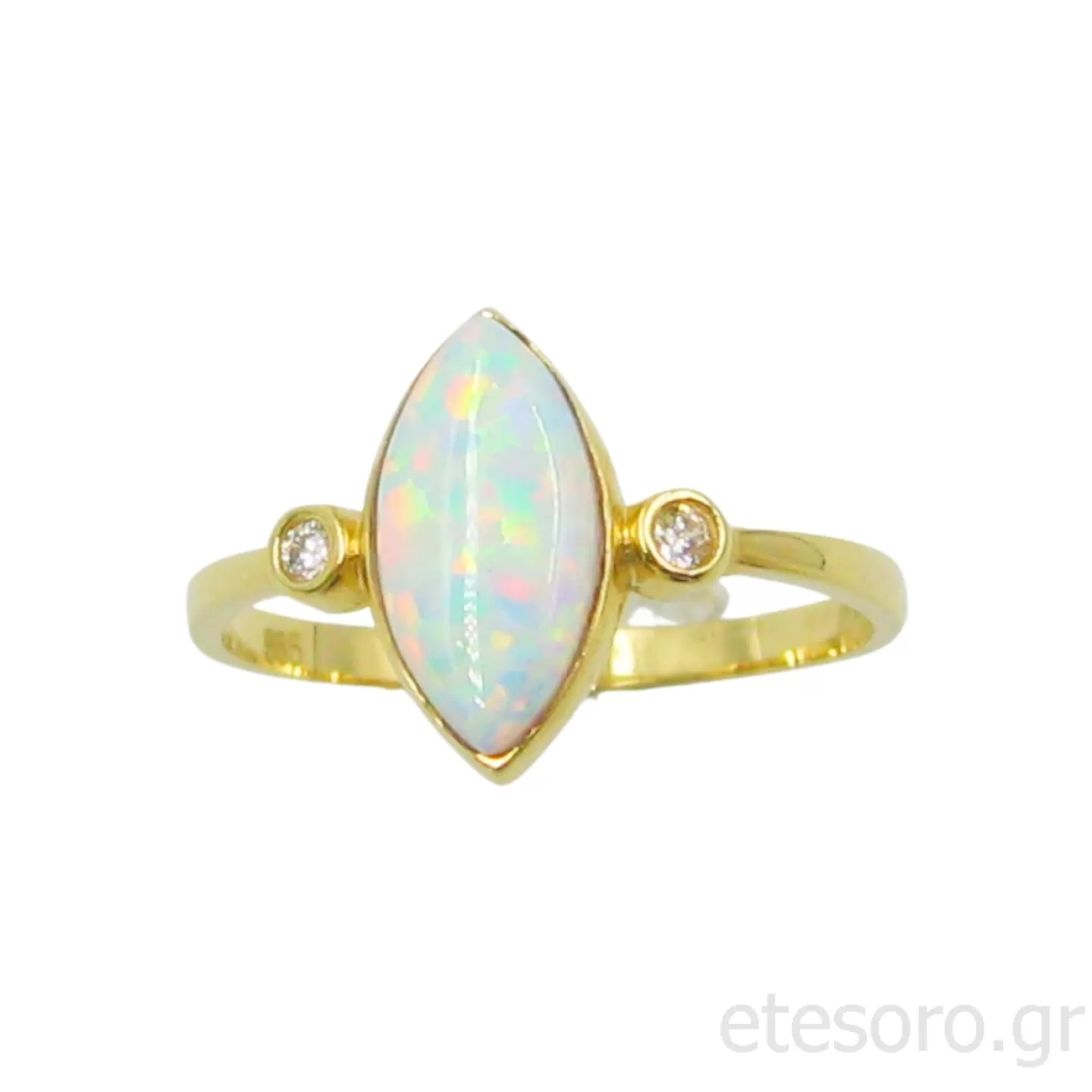Μια περίτεχνη, οβάλ πέτρα Οπάλιου στο κέντρο, συνδυασμένη με δύο Ζιργκόν εκατέρωθεν,