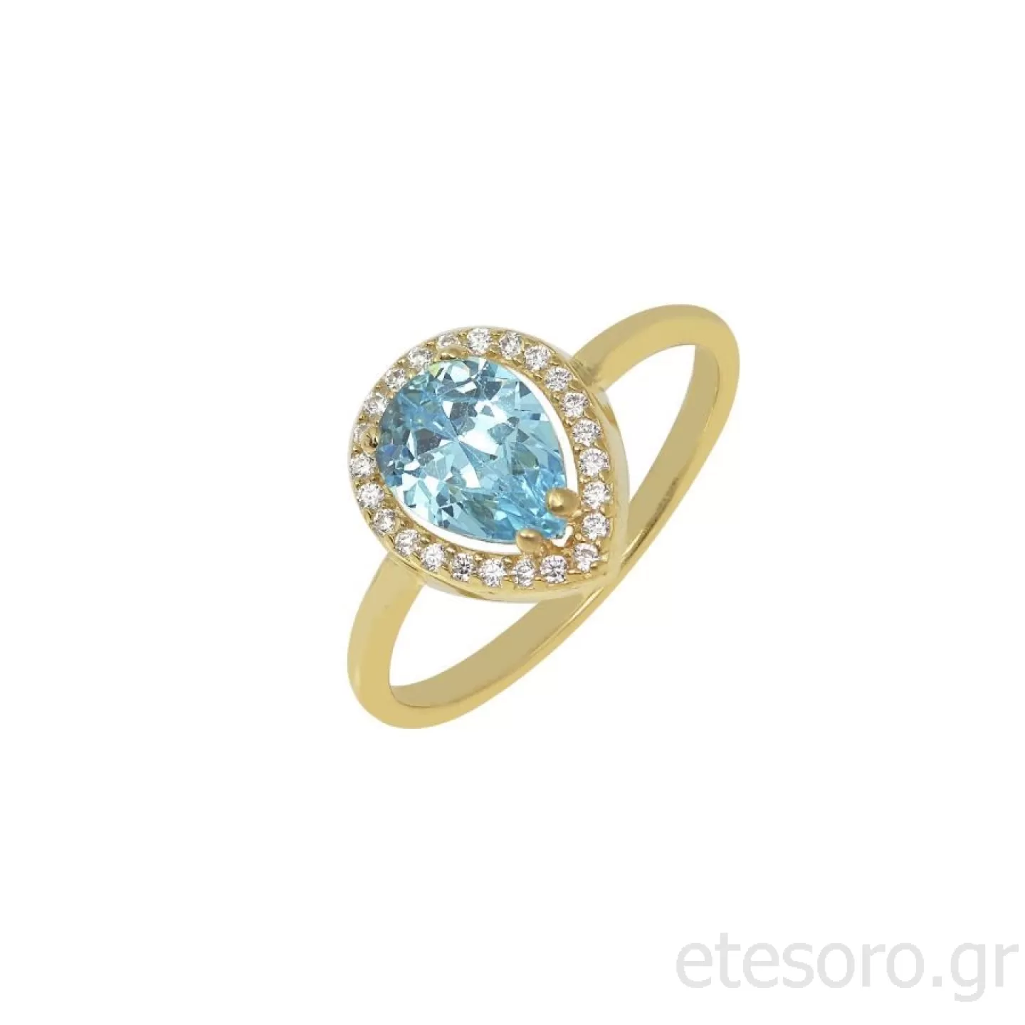 Στο κέντρο κυριαρχεί εκθαμβωτική γαλάζια πέτρα Ζιργκόν, σε σχήμα πουάρ,