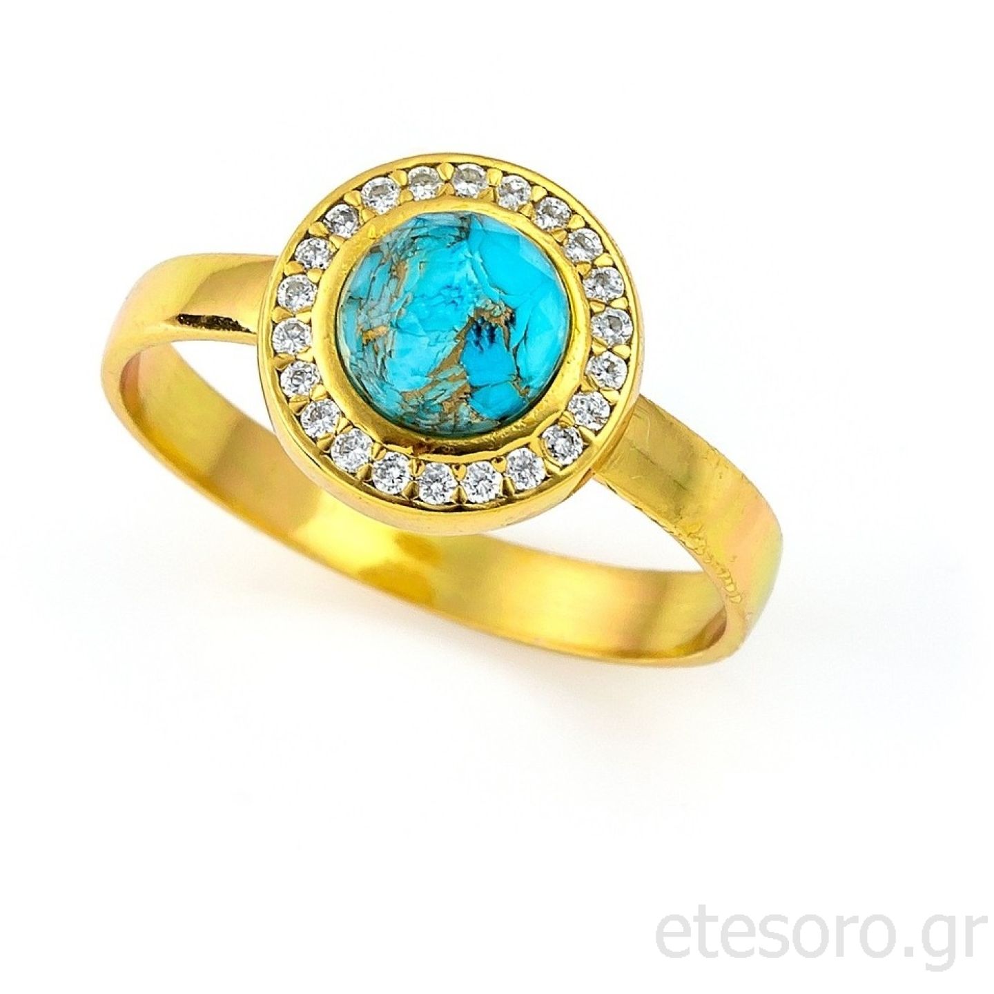 Δαχτυλίδι από ασήμι επιχρυσωμένο με πέτρα τυρκουάζ και κρύσταλο στο κέντρο και ζιργκόν περιφερειακά.
