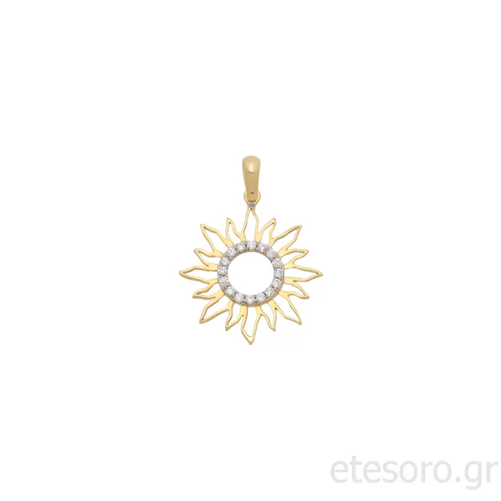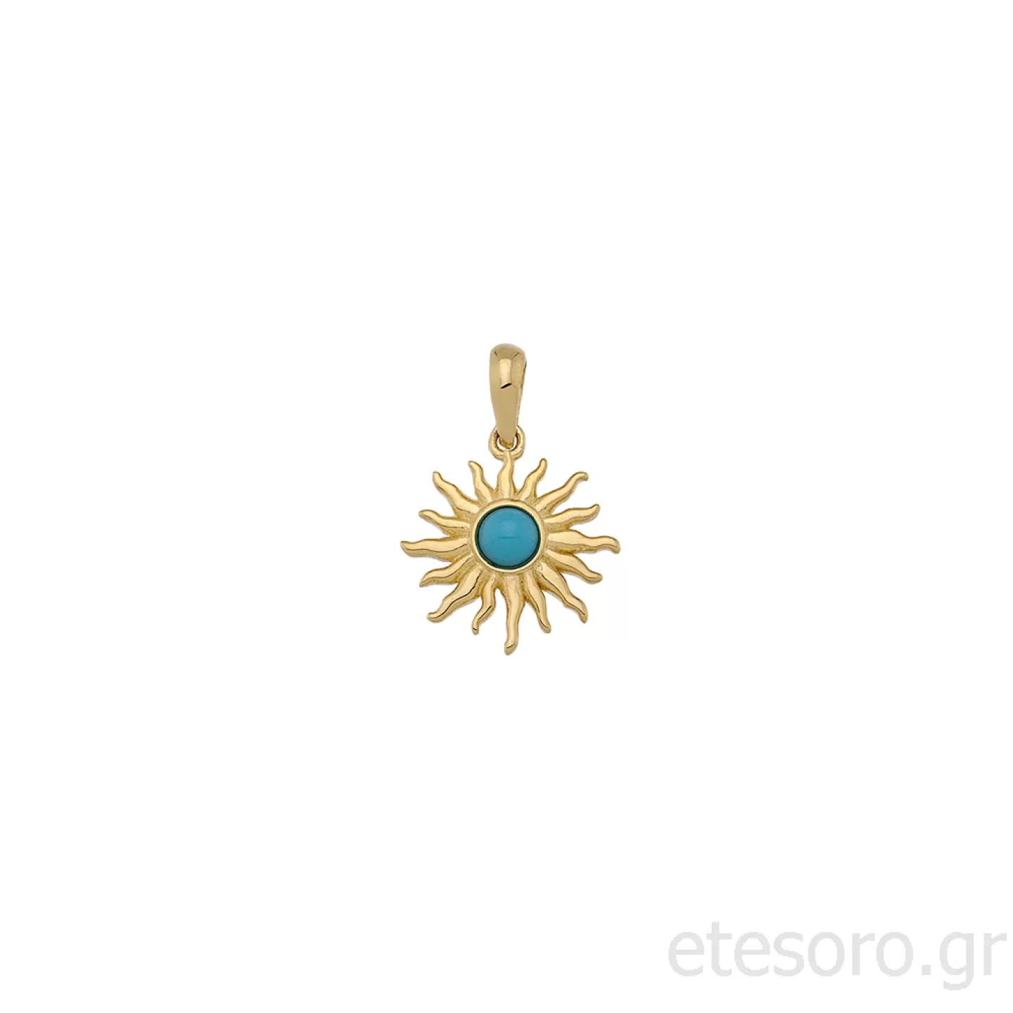 Χρυσό μενταγιόν Ήλιος 14 καρατίων, με γυαλιστερή υφή και μία πέτρα Τυρκουάζ στο κέντρο.