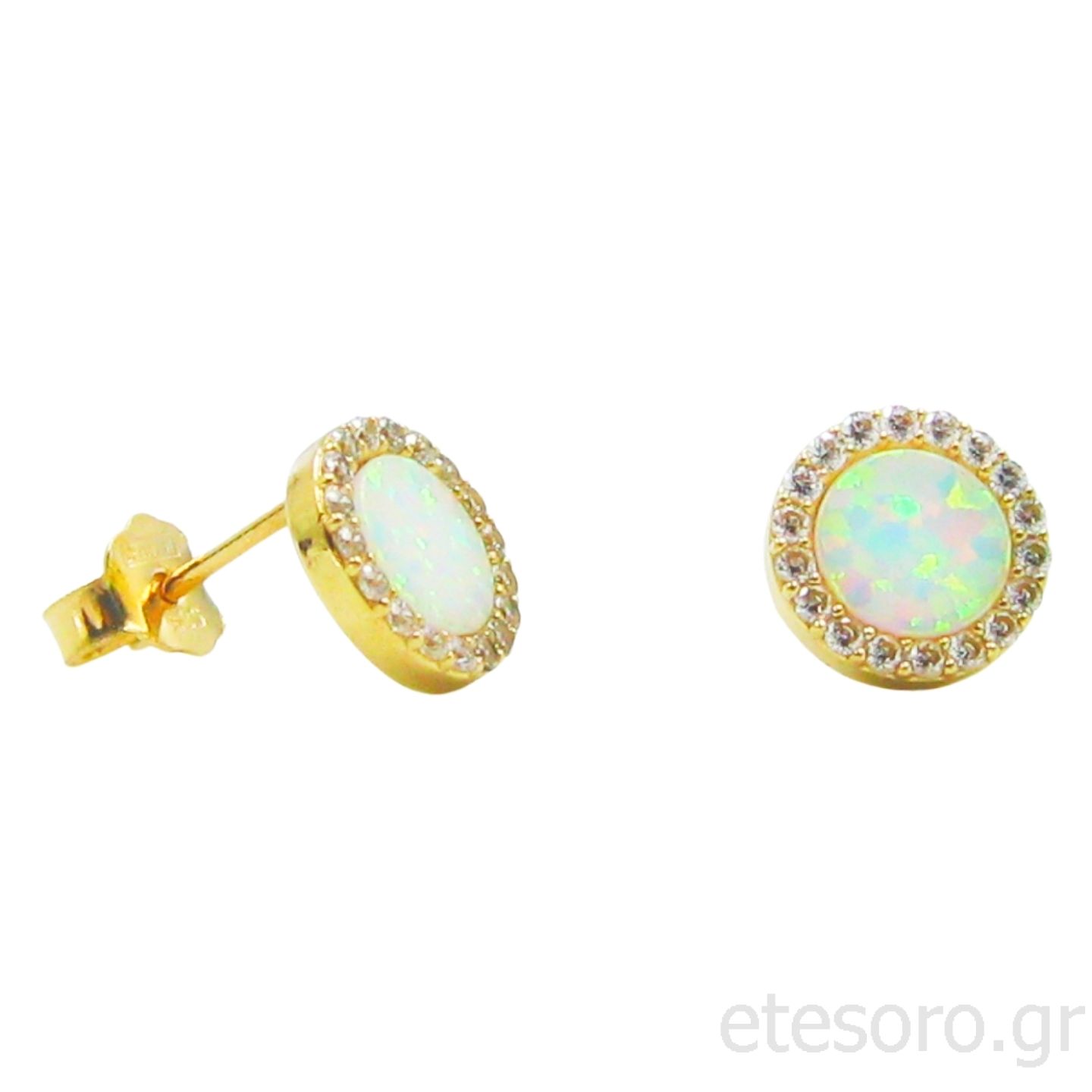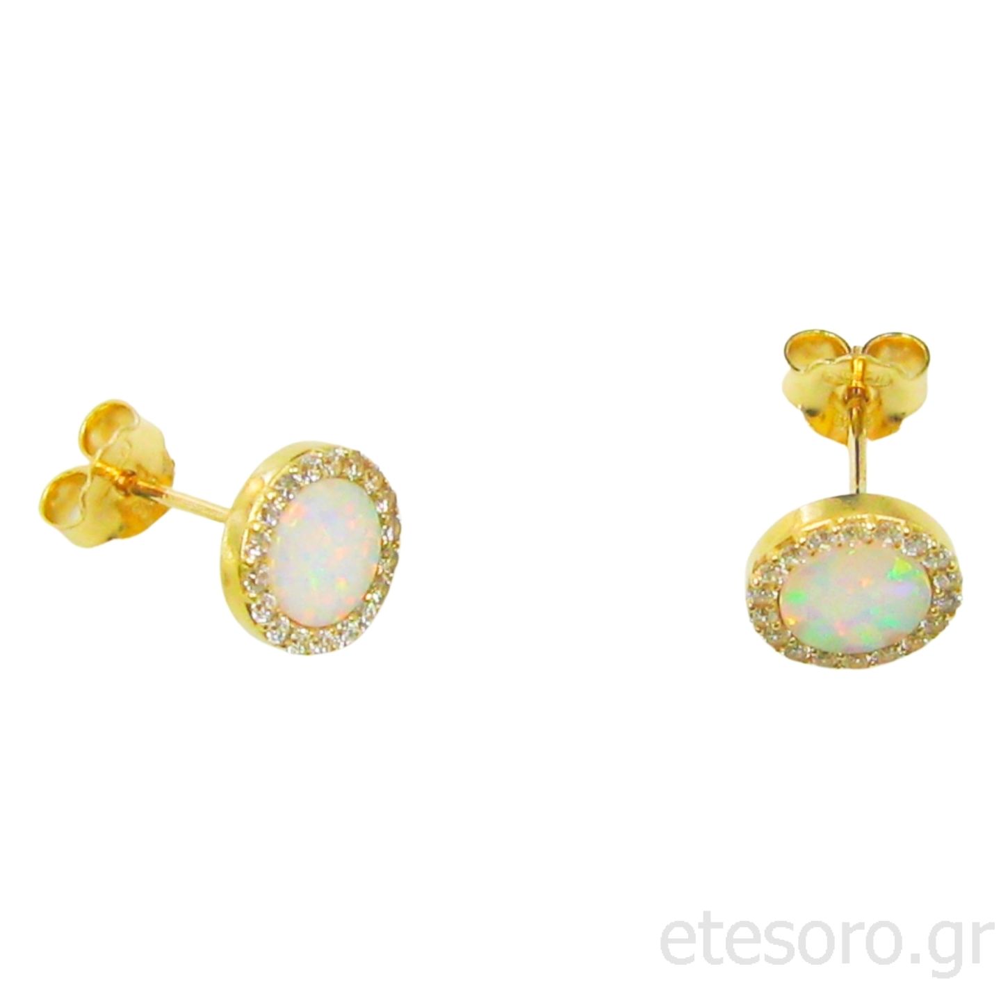 Χρυσά σκουλαρίκια 14K με με εντυπωσιακό οπάλιο στο κέντρο και ζιργκόν περιφερειακά.
