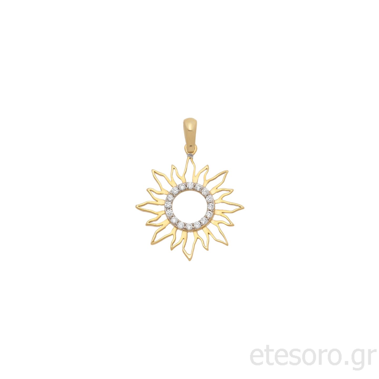 Χρυσό Μενταγιόν Ήλιος 14 καρατίων, με λουστρέ επιφάνεια. Στο μενταγίον υπάρχουν πέτρες λευκό ζιργκόν.