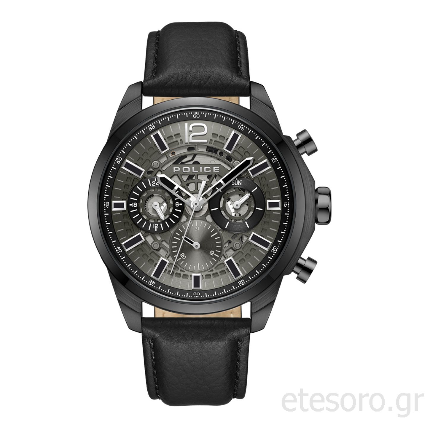 POLICE MENELIK Collection! Multifunction ρολόι ανδρικό με κρύσταλλο από φυσικό ορυκτό, με δερμάτινο λουράκι και μαύρη κάσα από ανοξείδωτο ατσάλι.